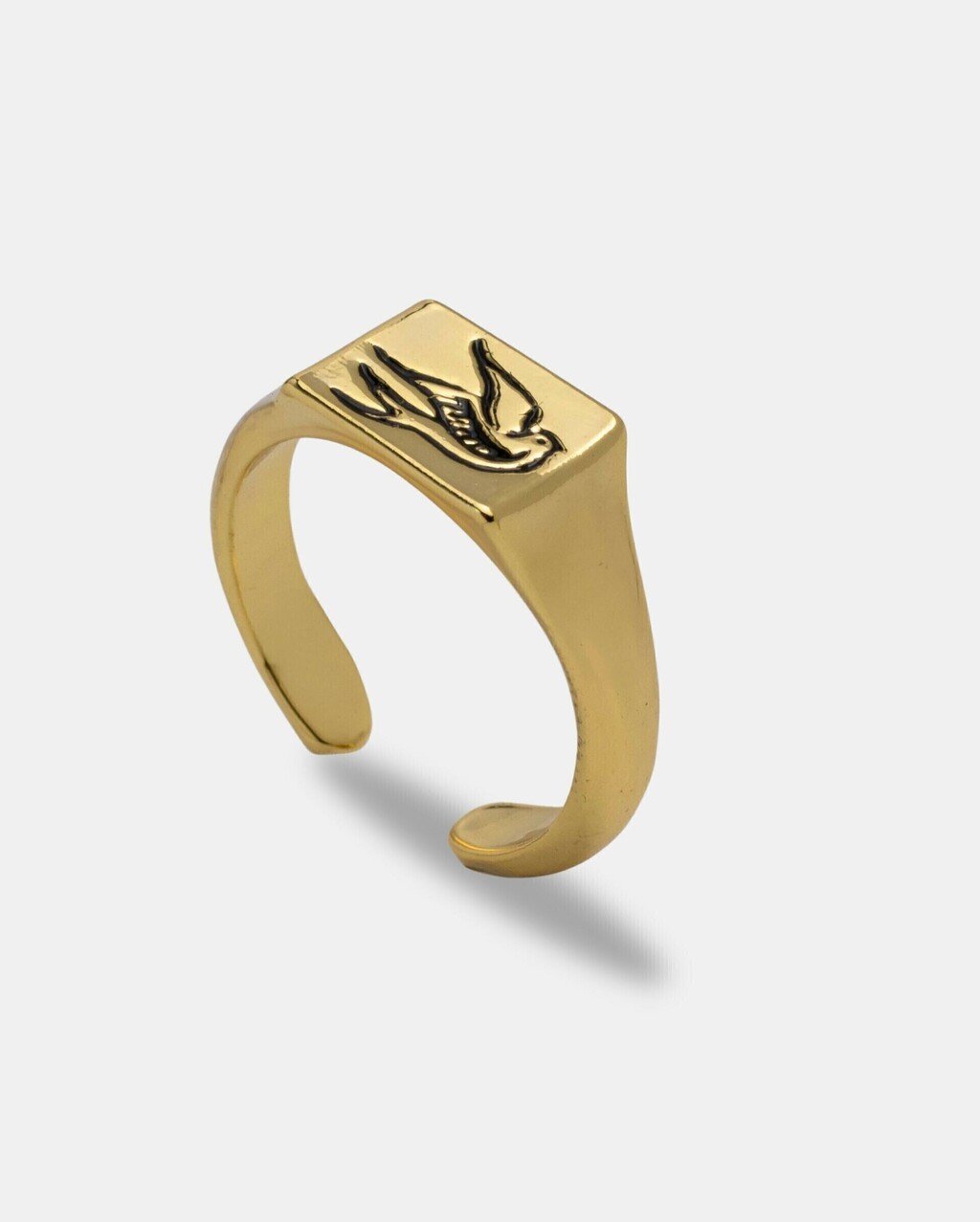 Base quadrada e andorinha desenhada à mão, esse anel carrega a essência da esperança para onde você for.