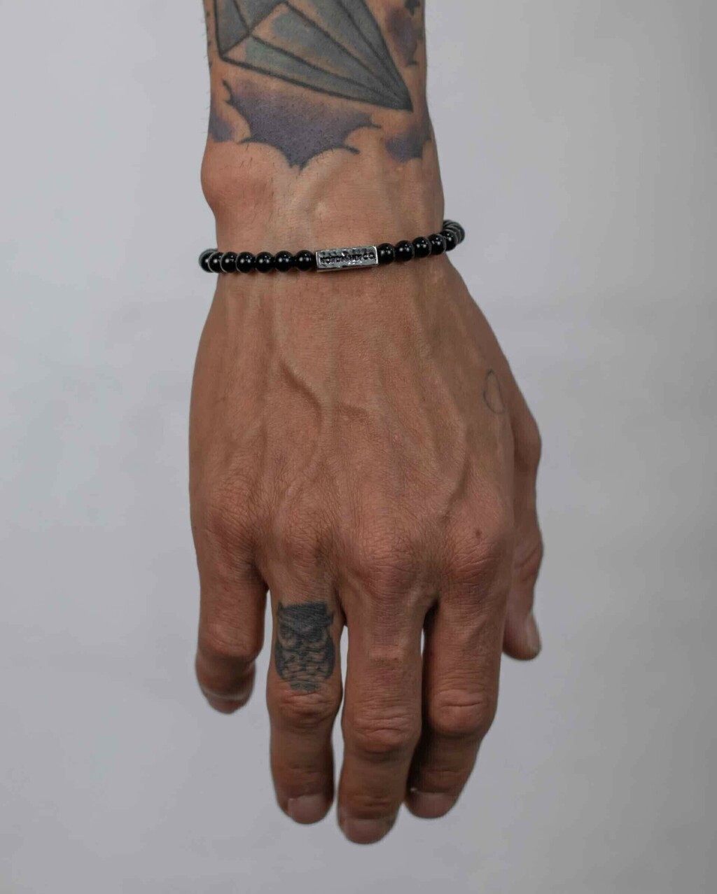 MATERIALMetal: LatãoPedras: Ônix natural 6mmFio: Nylon especialBanho: 1º camada Níquel + 2º camada Paládio + 3º camada Verniz especial