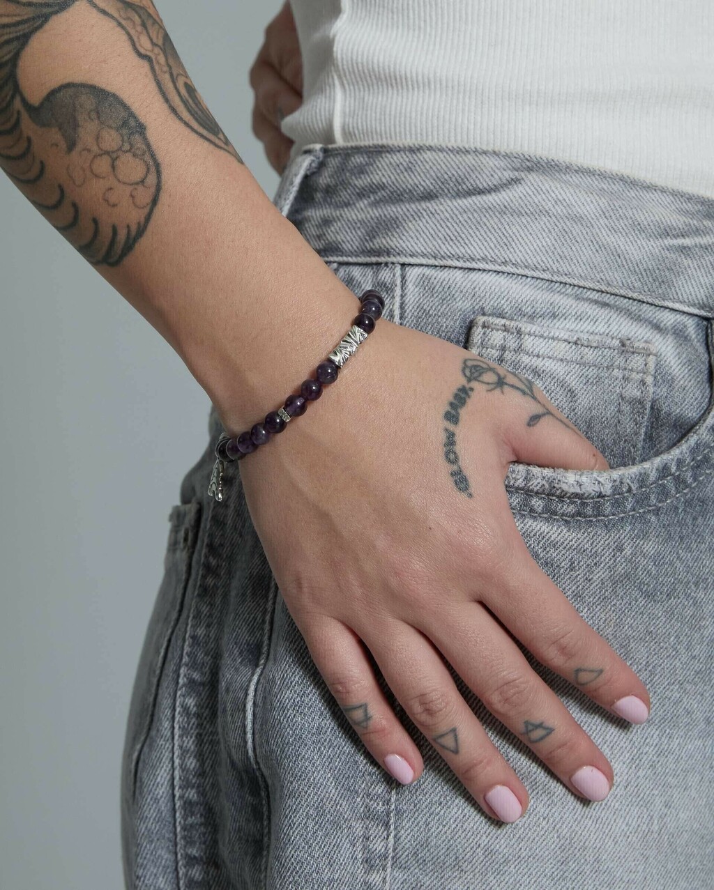 MATERIALMetal: LatãoPedras: Ametista natural 6mmFio: Nylon especialBanho: 1º camada Níquel + 2º camada Paládio + 3º camada Verniz especial